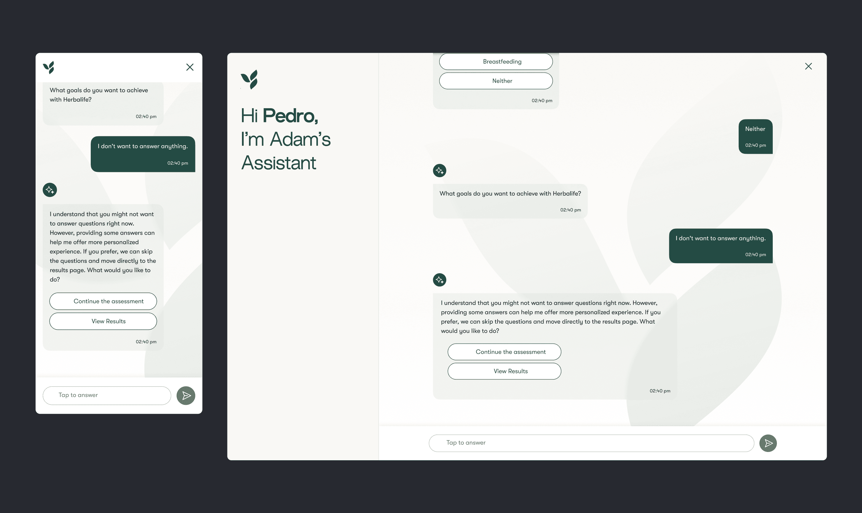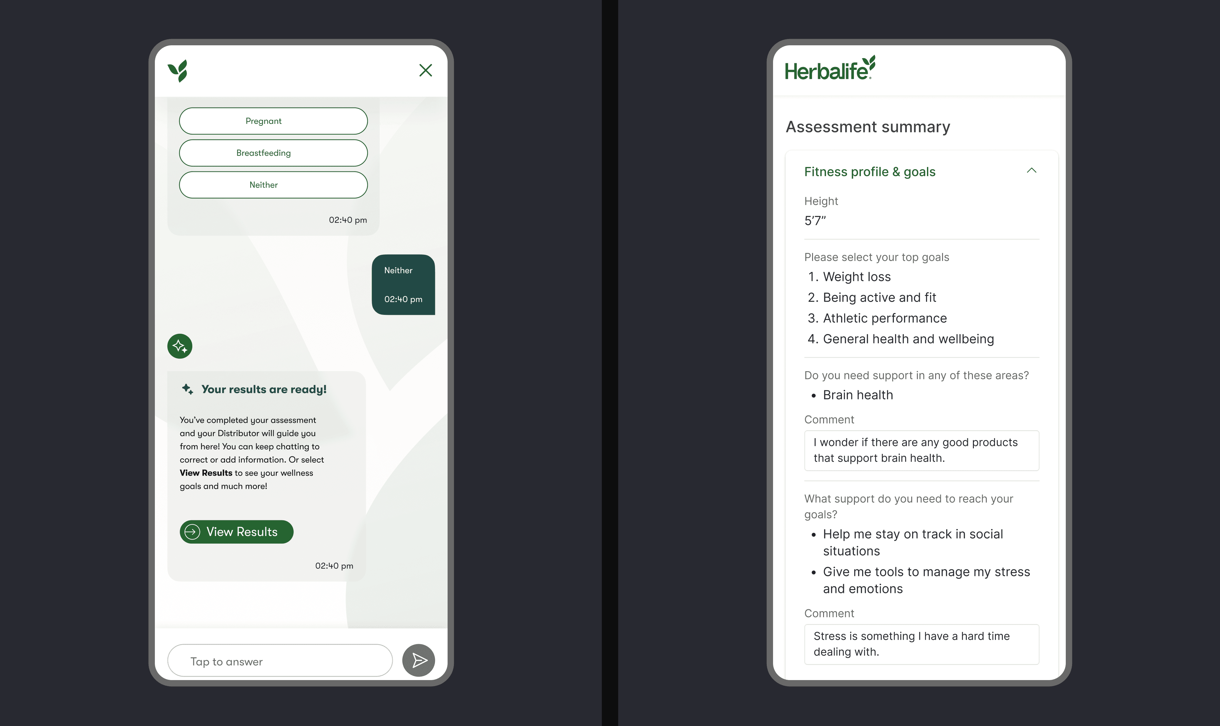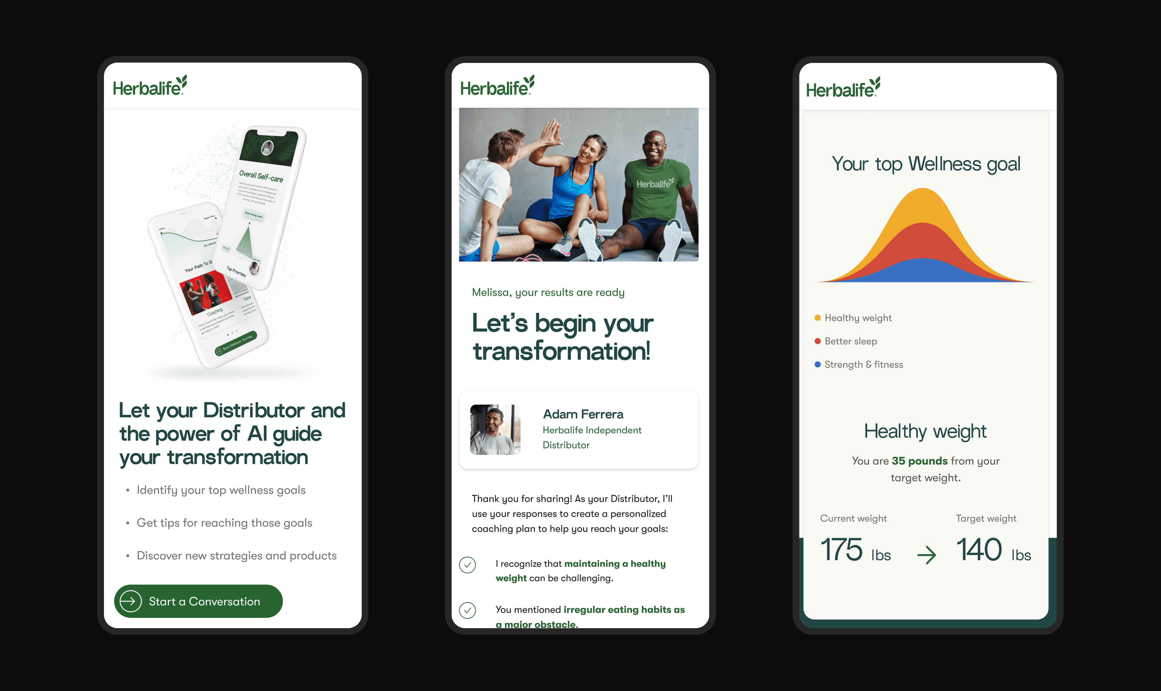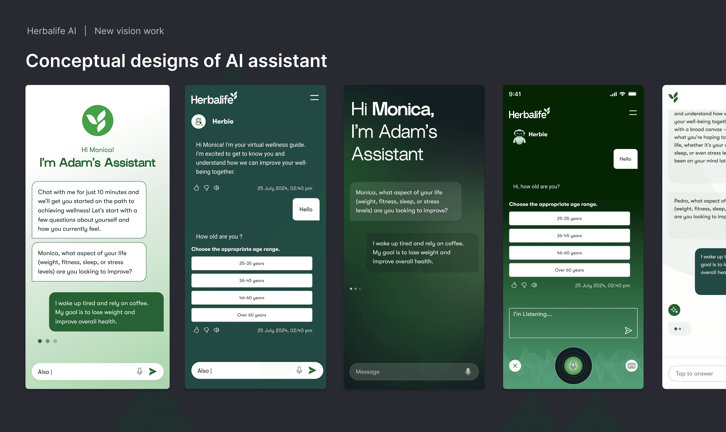 Once the flow and scenarios were defined, I started working on conceptual designs that aligned with Herbalife’s brand guidelines while also pushing for a fresh, innovative direction. My goal was to create something unlike anything Herbalife had before — modern, intuitive, and engaging — while still maintaining brand consistency.